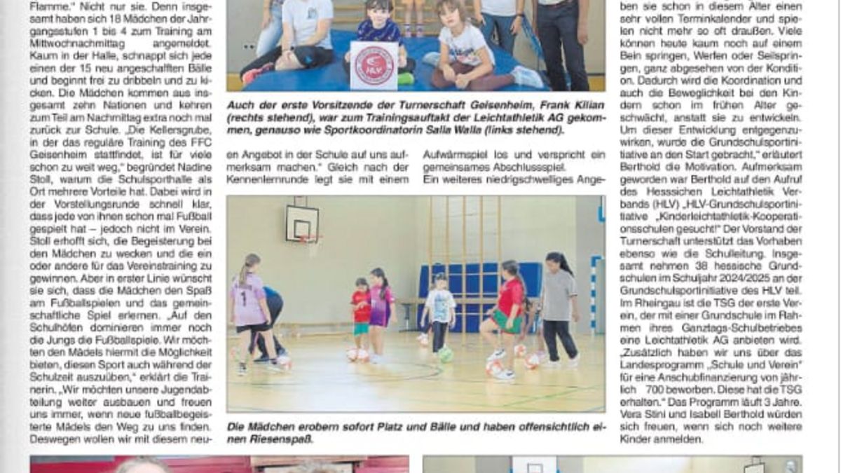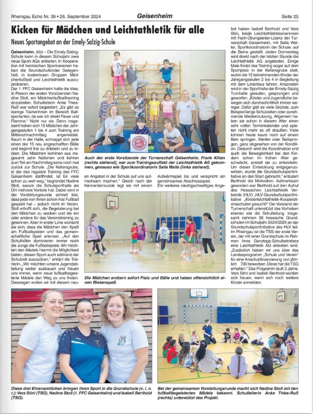 Seit dem Schuljahr 2024/25 bietet die Emely-Salzig-Grundschule in Kooperation mit dem Hessischen Leichtathletik-Verband und der Turnerschaft Geisenheim 1848 e.V. jeden Donnerstag nach der letzten Schulstunde eine Leichtathletik AG für die Jahrgangsstufen 2 bis 4 an.