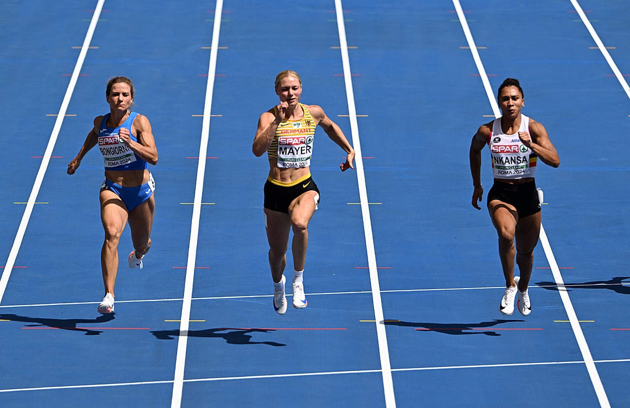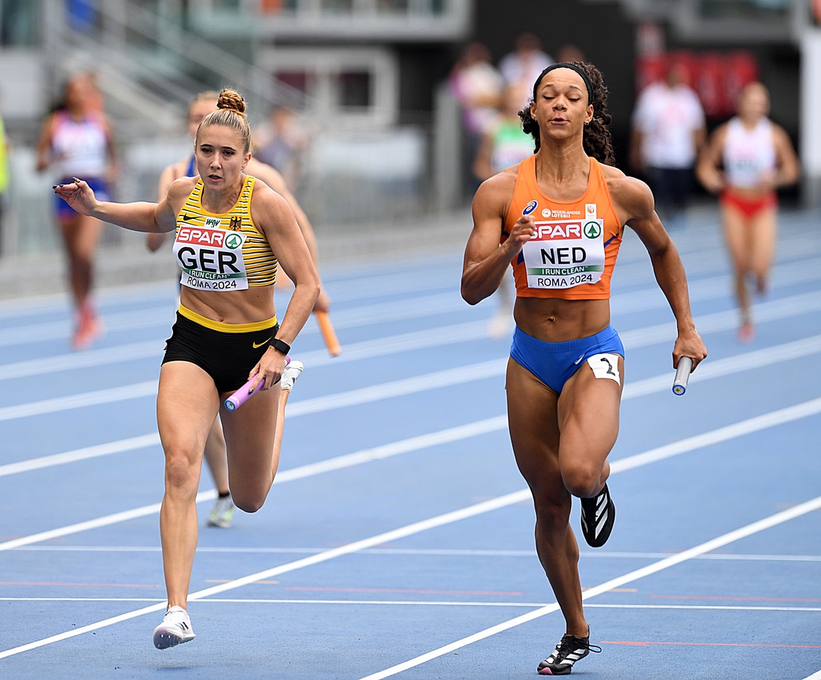 Das zweite große Highlight des Vormittages waren die beiden 4x100m Staffeln der Frauen und Männer. Bei den Frauen liefen gleich drei Hessinnen mit: Sophia Junk als Startläuferin, Lisa Mayer an Position 2 und Rebekka Haase auf Position 4. Im ersten von zwei Vorläufen bekamen es die deutschen Frauen unter anderem mit den USA, die bereits drei Medaillengewinnerinnen aus Paris in ihrer Staffel vereinten, zu tun, die auf der angrenzenden Bahn 6 unterwegs waren. Das Ziel war klar ausgegeben: einen der ersten 3 Plätze erreichen, um sich direkt für das Finale am morgigen Abend zu qualifizieren. Sophia Junk als Startläuferin lief eine gute erste Kurve und konnte bereits in aussichtsreicher Position auf Lisa Mayer übergeben. Mayer konnte die Position im vorderen Feld halten und sicher auf Gina Lückenkemper übergeben, die auf Position 3 die zweite Kurve hervorragend lief. Eingangs der Zielgeraden wurde Haase sogar überraschenderweise als Führende auf den Weg geschickt, diese konnte das starke Finish und den Vorlaufsieg der USA aber nicht verhindern. Im Endergebnis steht ein 2. Platz mit Saisonbestleistung für die deutsche Staffel, die sich damit sicher für das Finale qualifizieren konnte. In der Gesamtbetrachtung liegt die deutsche Staffel auf Platz 4 nach beiden Vorläufen, lediglich zwei Hundertstel trennen die auf drei liegenden Französinnen von den Deutschen. Im DLV-Interview gab Lisa Mayer das Ziel für das Finale vor: "... um die Medaillen mitrennen"!